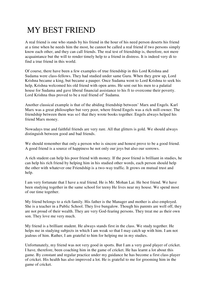 A best friend is one who loves the truth and you‚ and will tell the truth in spite of you. There are lots of people who you make friendship with‚ but it is very hard to find a true and honest friend. But I am very lucky that I have a best friend with whom I can share my feelings with. His name is Max Short Essay on Best Friend – Essay 2 ( Words) The one person in the world that will give you equal love and devotion like your parents and lovers is your best friend. My best friend is Mark. We both study in the same school. Mark also Estimated Reading Time: 9 mins Narrative Essay About Best Friends. Best friends are the only thing in the world that stick by your side through the hard spells no matter what is occurring. They are the ones that tell you that look great in the morning, speak up for you when you do not, make you smile when no else can and they are the ones that love you for who you are